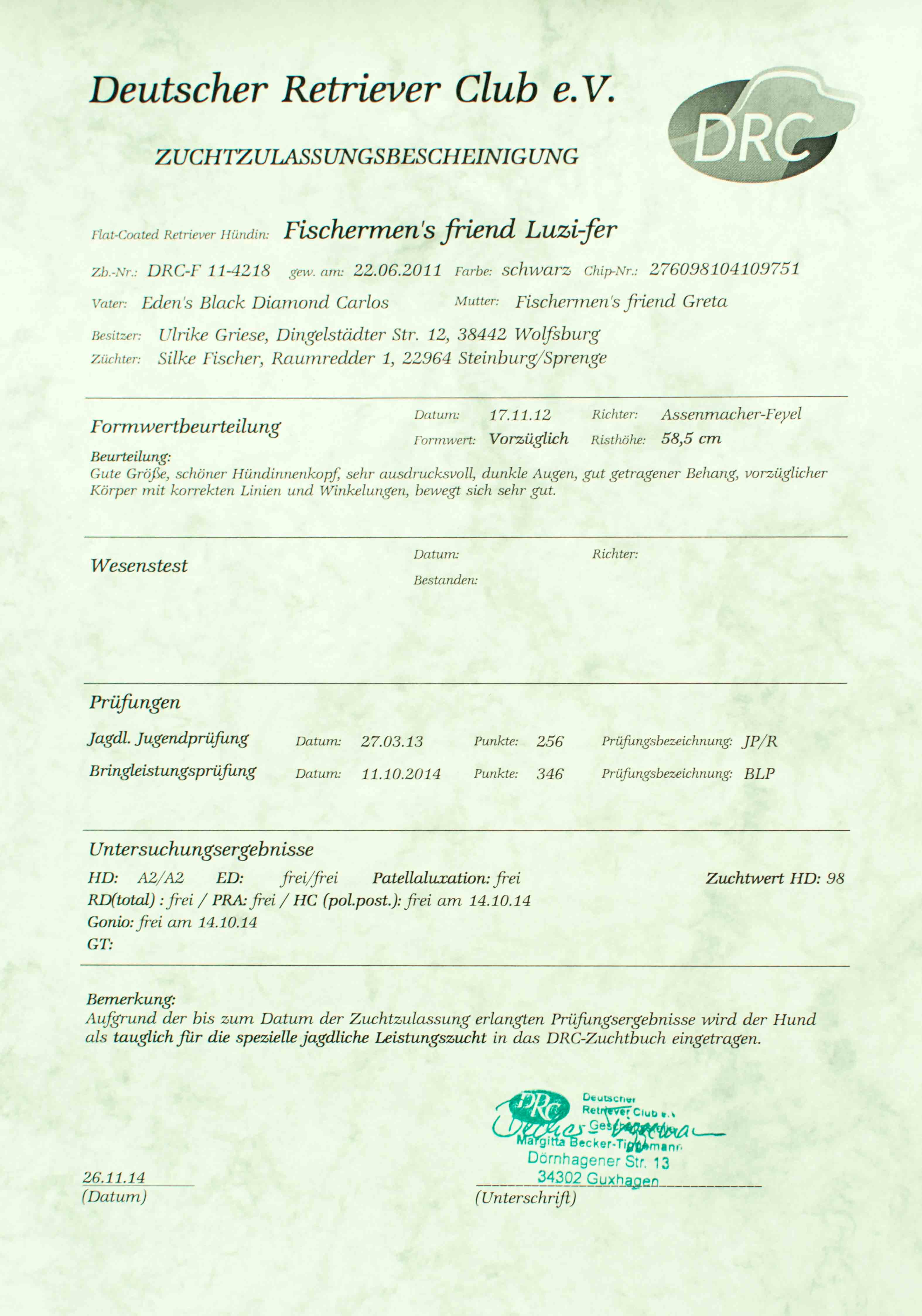 Wir züchten nach den, vom Deutschen Retrievr Verein (DRC ev.) streng vorgegebenen Richtlinien. Auch unsere Hündin und ihr „Mann“ entsprechen den Vorgaben des DRC.
