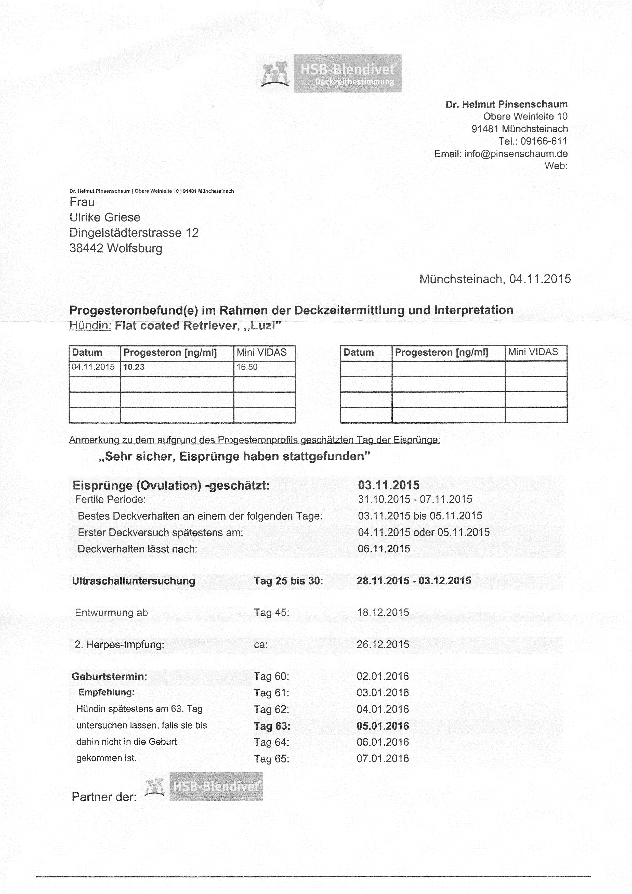 Weil uns die Zeit etwas knapp erscheinen wollte, da wir spätestens Donnerstag Mittag wieder nach Hause musste, zumal unser kleiner Jonathan einen schlimmen Brechdurchfall hatte, sind wir sicherheitshalber noch einmal zum Tierarzt gefahren und haben den Progesteronwert bestimmen lassen.